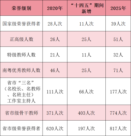 外引人才与内育骨干并举,花都构筑起“国家级引领、省市级骨干、区级支撑”的教师人才“金字塔”。五年来,引进高层次人才4名,培育国家级人才3名;新增南粤优秀教师25人、特级教师11人、正高级教师25人,省市级名校长、名教师、名班主任66人次,省市级骨干教师403人次。国家级荣誉获得者从28人次增至39人次,省市级荣誉获得者从620人增至817人,这支“引得进、留得住、长得快、成得优”的教师队伍,成为花都教育高质量发展的核心引擎。
